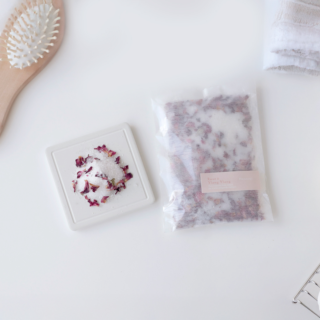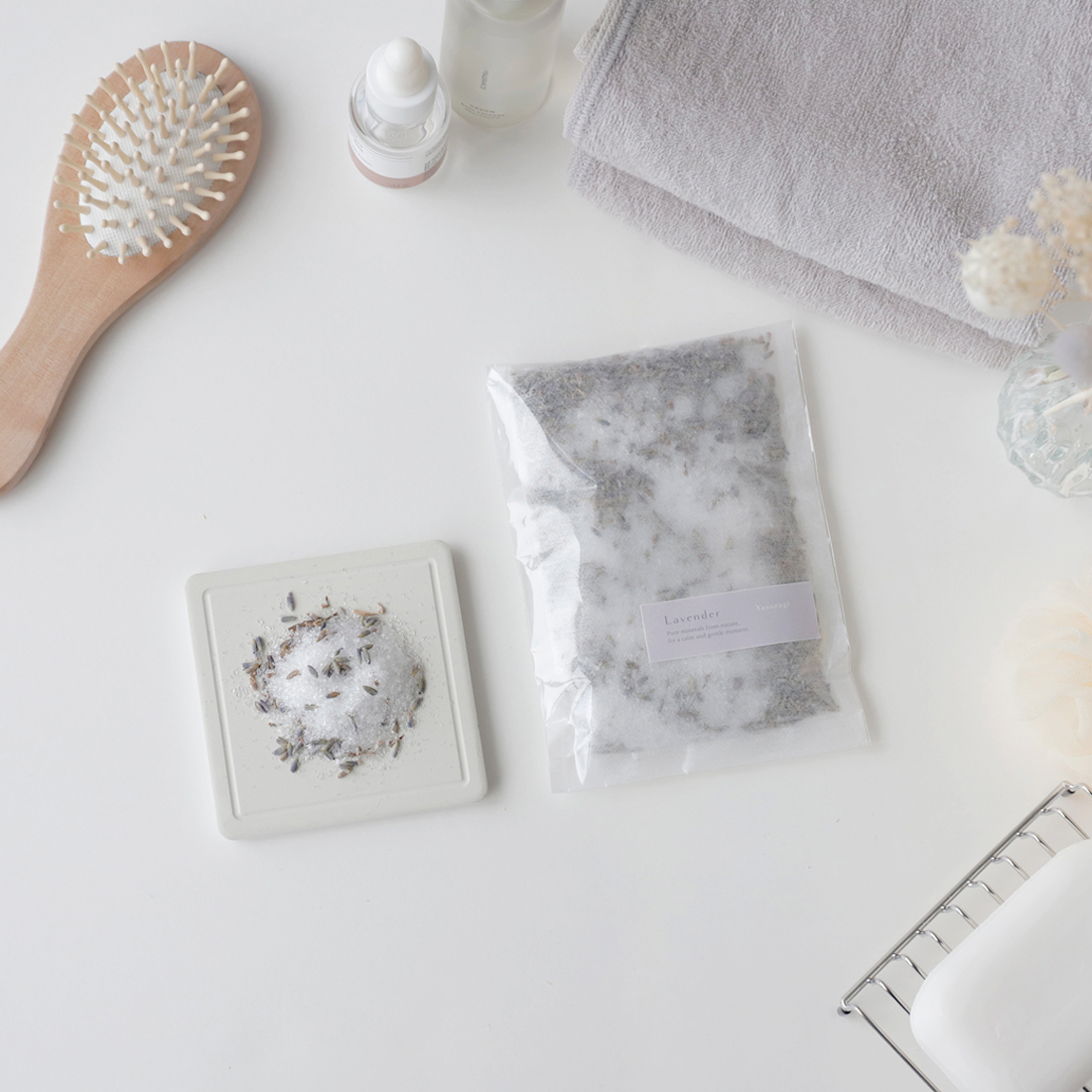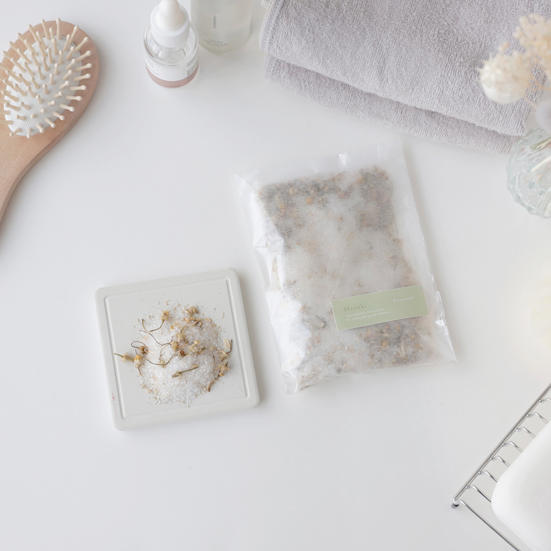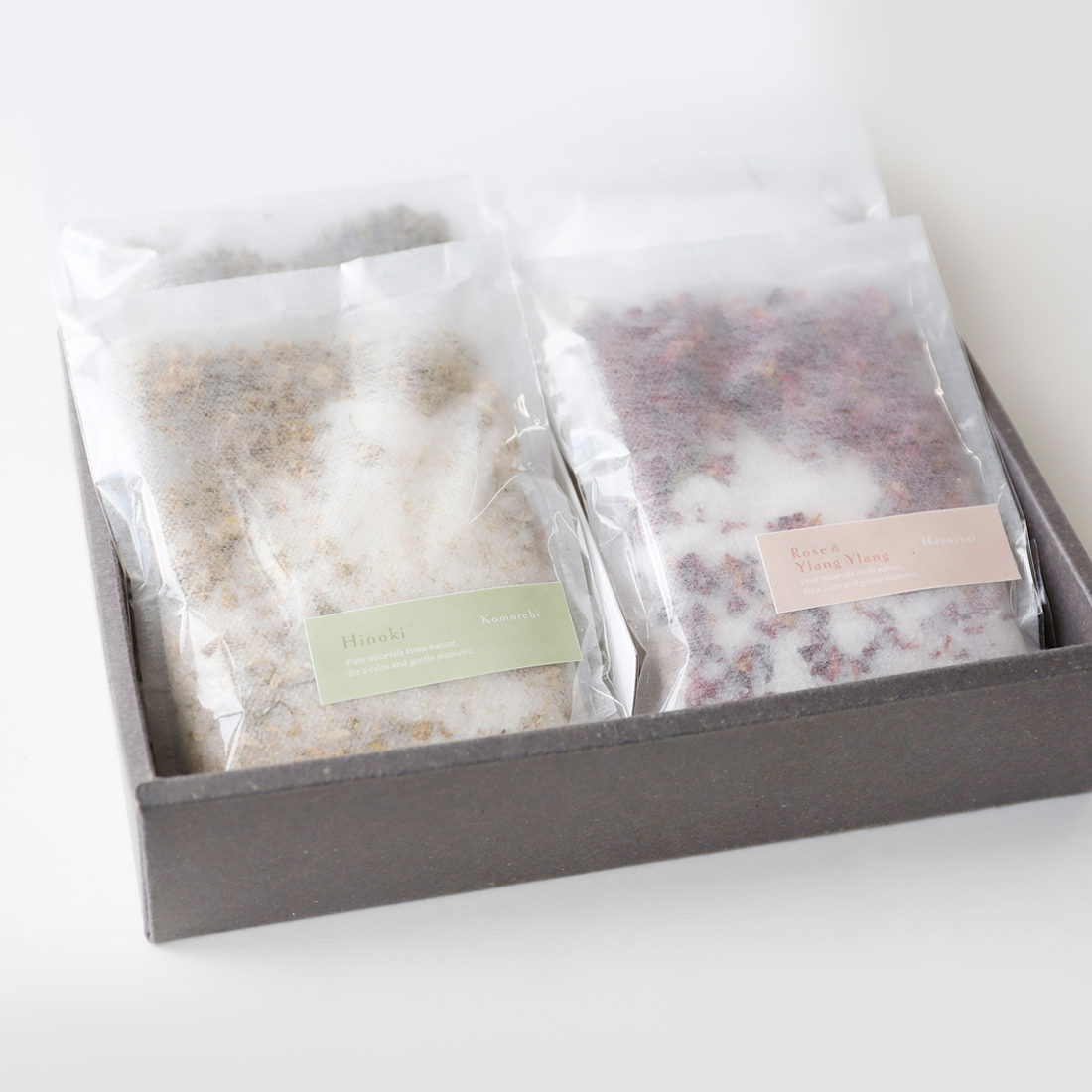 主成分は硫酸マグネシウム。香り付きタイプには精油やドライハーブを使用しています。